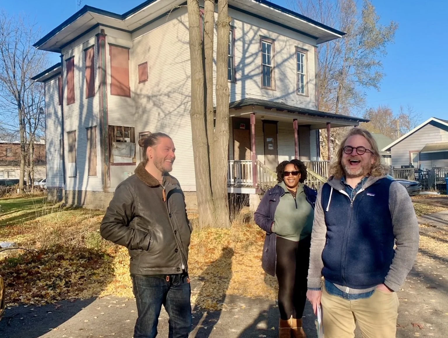 From left, Derek Mann, I’Yanna Wilson and Zac Bauer are in good spirits as the talk about the renovation of the spacious Italianate house at 1212 Brownell St. In Kalamazoo’s Edison Neighborhood.